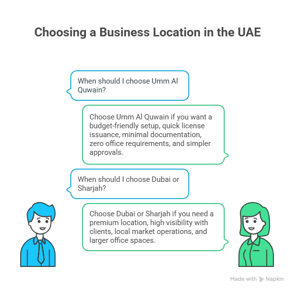 - Expert experience: An e-commerce seller we worked with insisted on Dubai because “that’s where the action is.” After comparing actual costs, he shifted to UAQ and cut his setup budget by almost 40%, money he later invested in inventory and marketing.