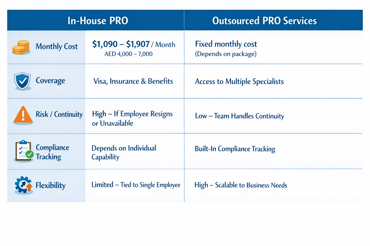 For most SMEs, outsourcing PRO services provides better continuity and lower annual costs, especially when visa activity fluctuates.
